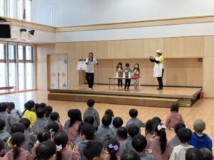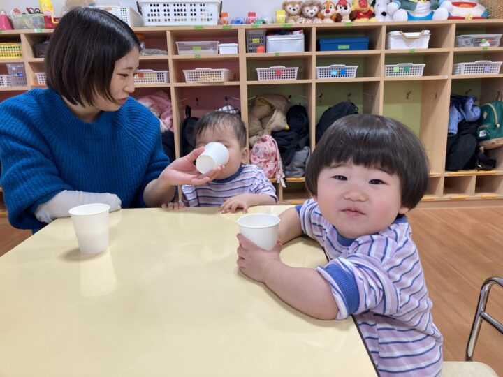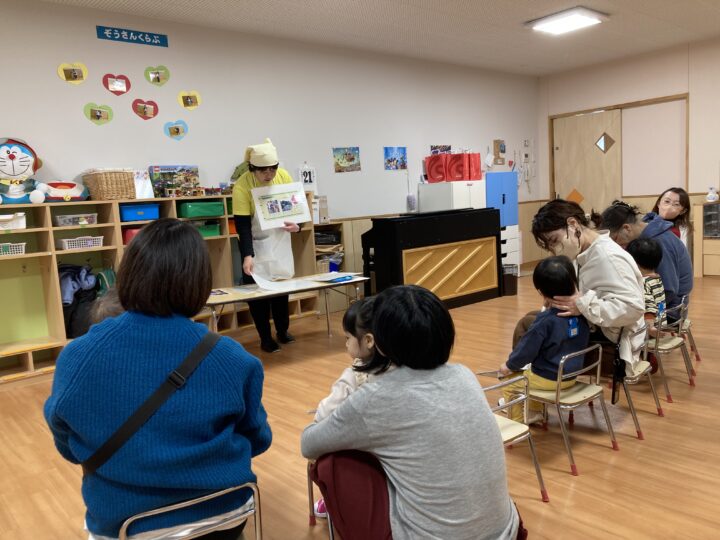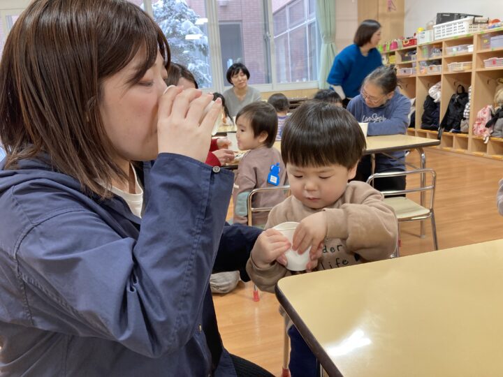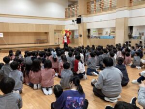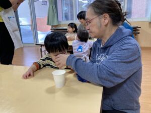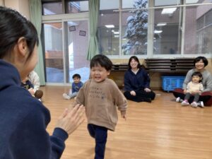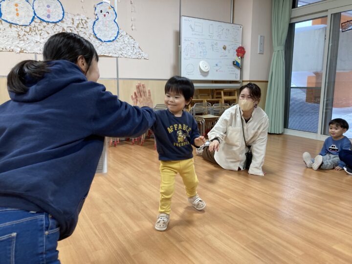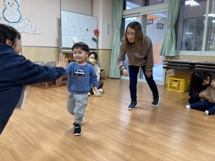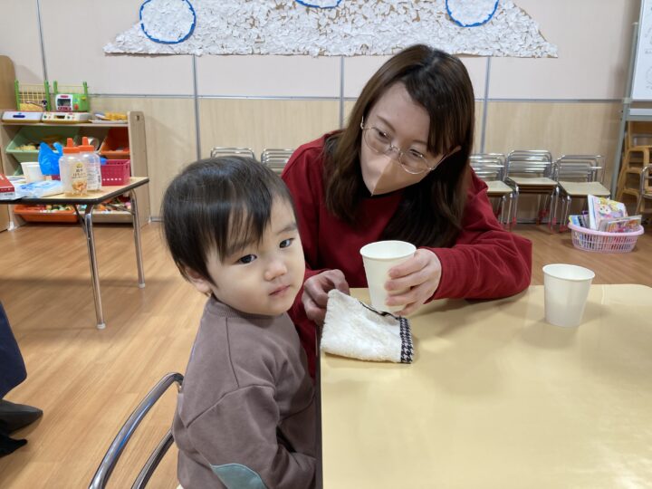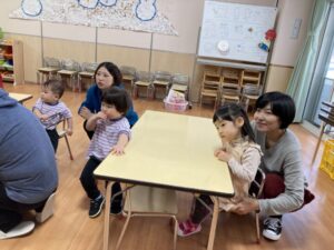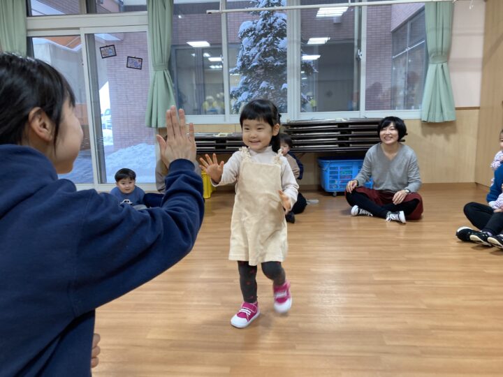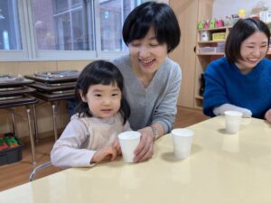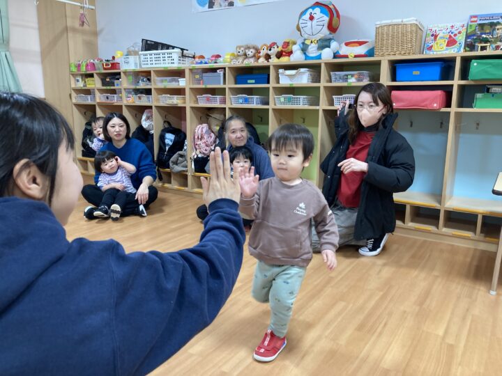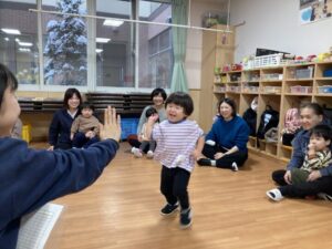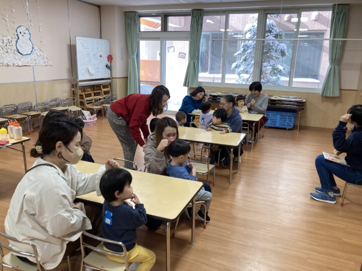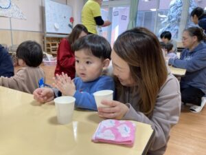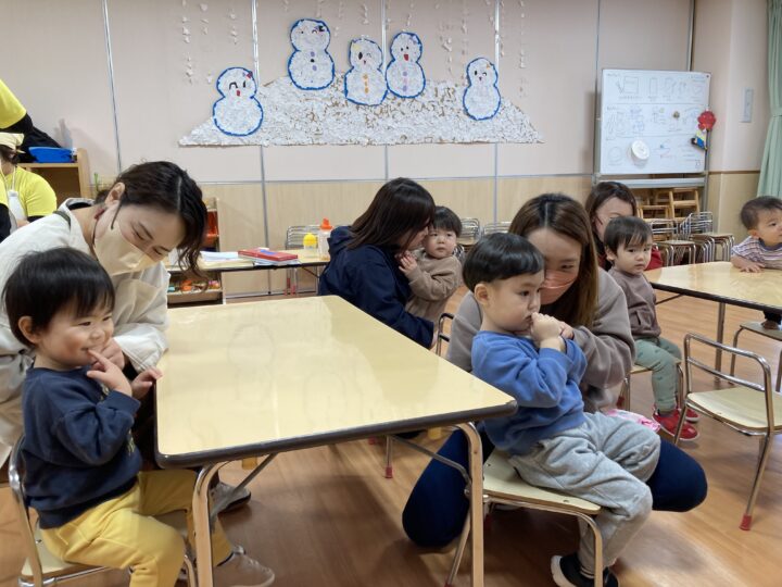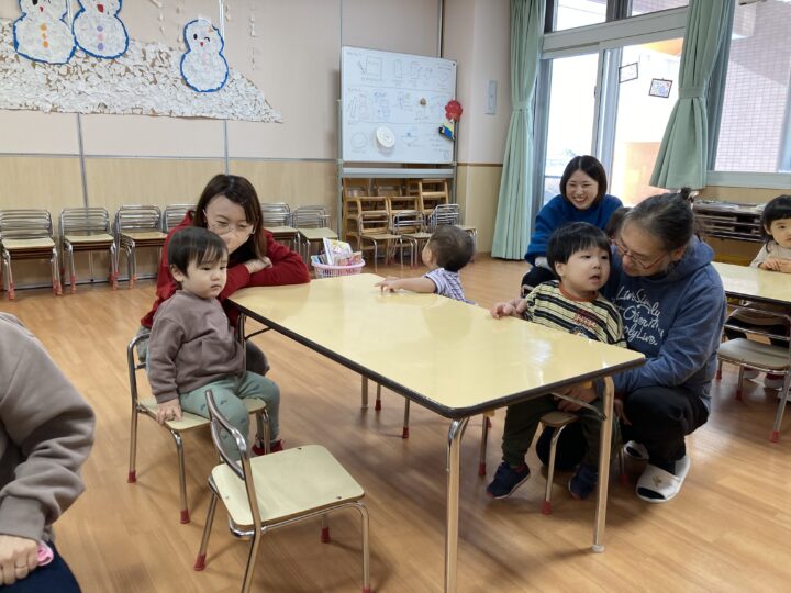 年末年始の事を聞くと、「大掃除を手伝ったよ」「おばあちゃんのお家に行ったよ」「今お金たくさんある」など、次々と教えてくれたり、誰と・どこで・どんなことをした、と上手にお話しできるようになった子もいました。一生懸命に話す子ども達を見て、各ご家庭で楽しく過ごされた様子が伝わり、温かい気持ちになりました。
