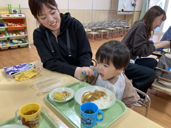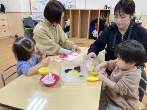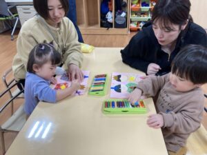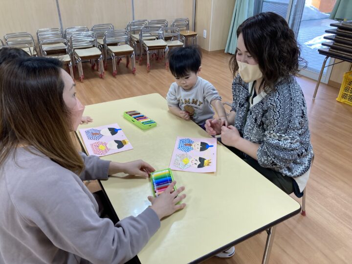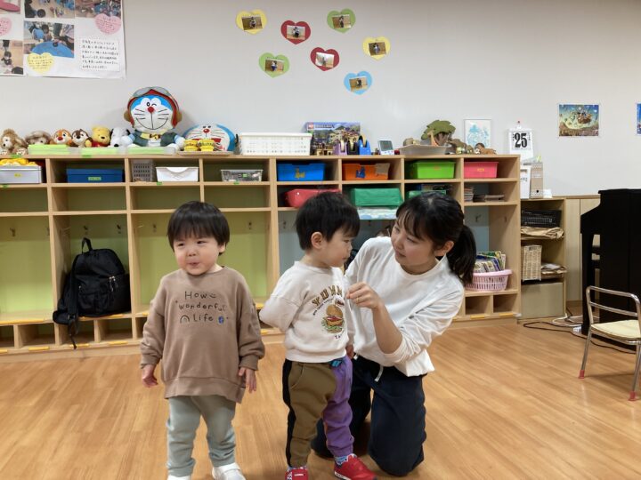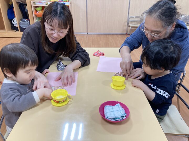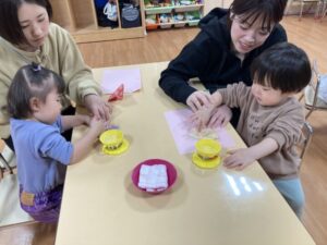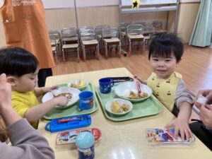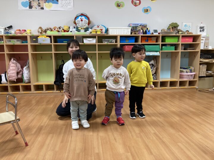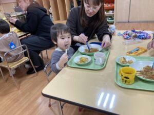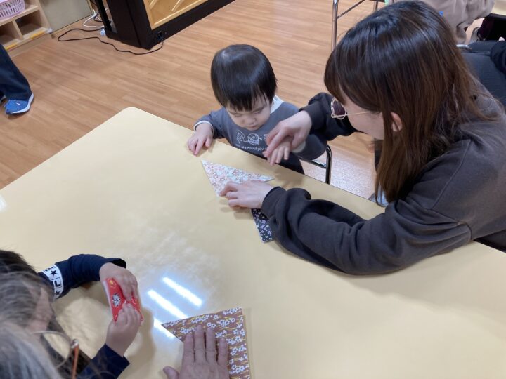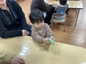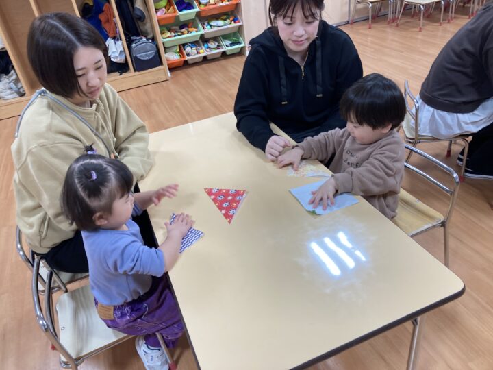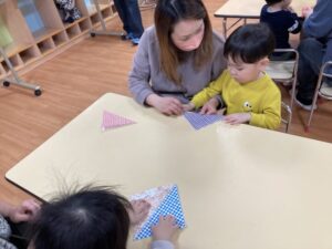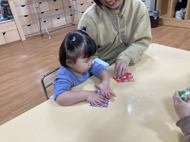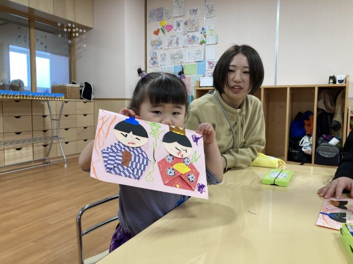 2026.02.25 2月25日(水)ぞうさんくらぶ 今日は、ラッキーイス取りゲームをしました。どの子もルールを理解して、当たって喜んだり、インタビューに答えたり、とても上手にできていましたよ。 折り紙を使って作ったひな祭り製作もそれぞれ違う絵柄で可愛らしく出来ましたね。初めての給食もみんなで美味しく食べる事ができました。