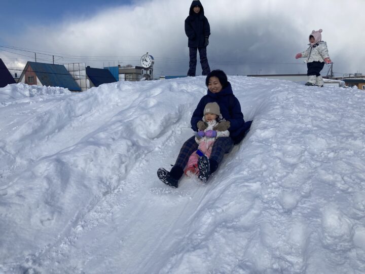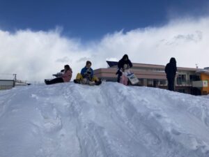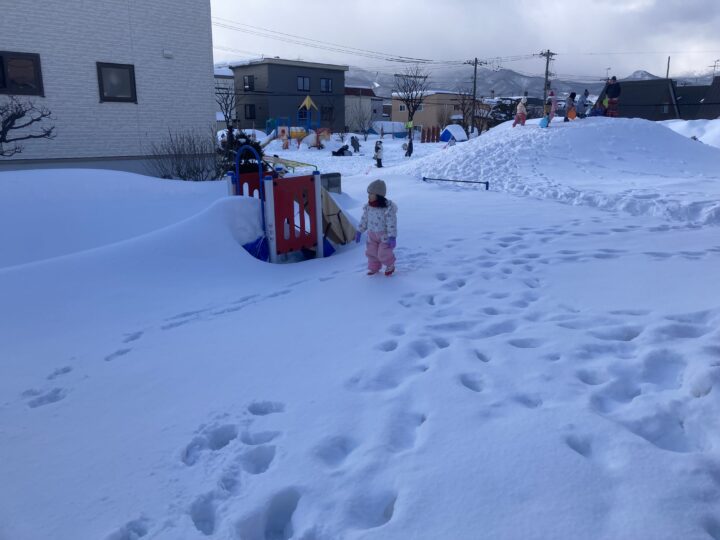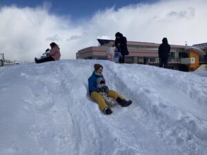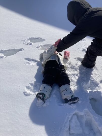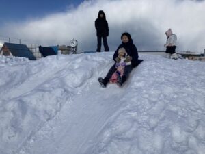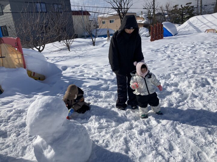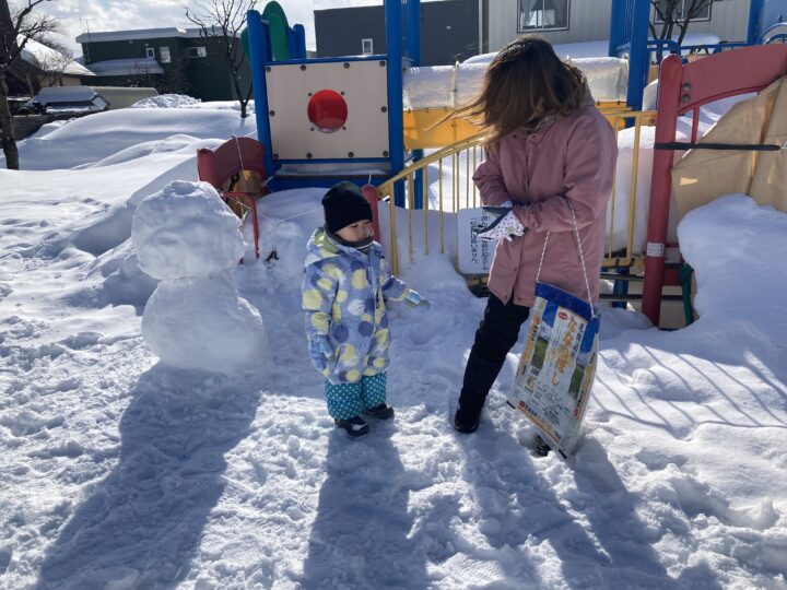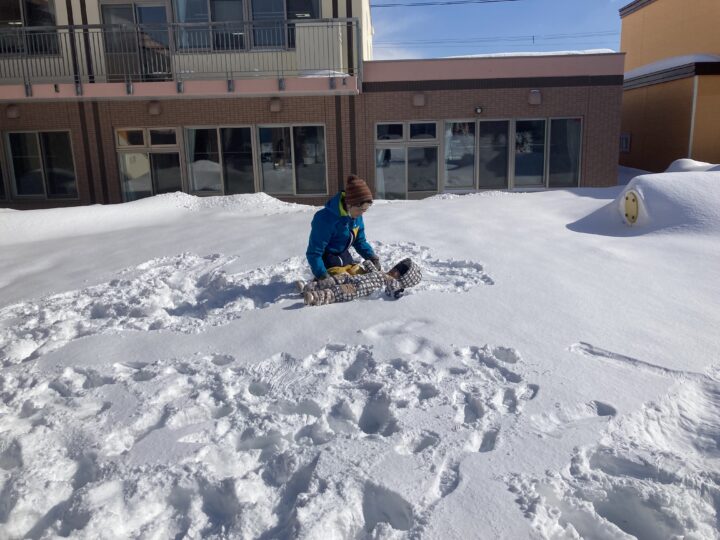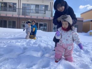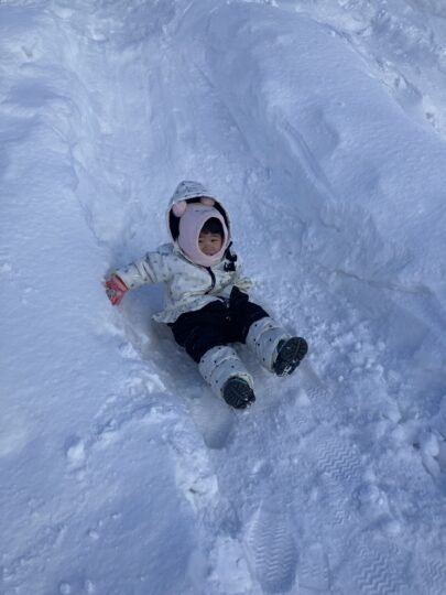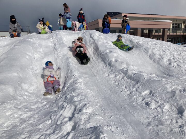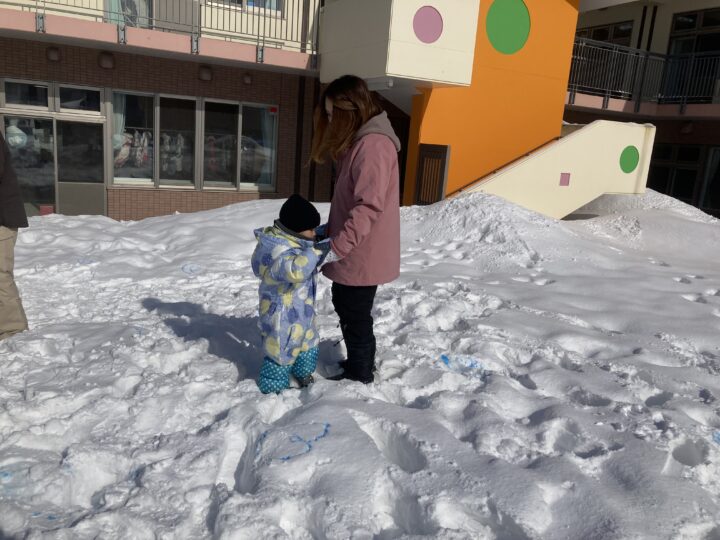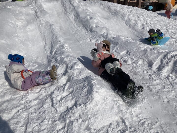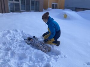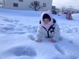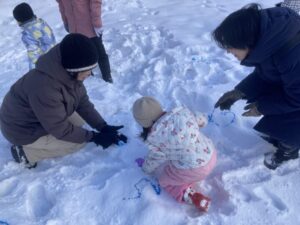 ハサミやクレヨンを使って上手にできましたね。ぞうさんくらぶでは初めての雪遊びもしました。お家の人とそり滑りをしたり、雪の上のお絵かきを探しに行ったり楽しかったですね。